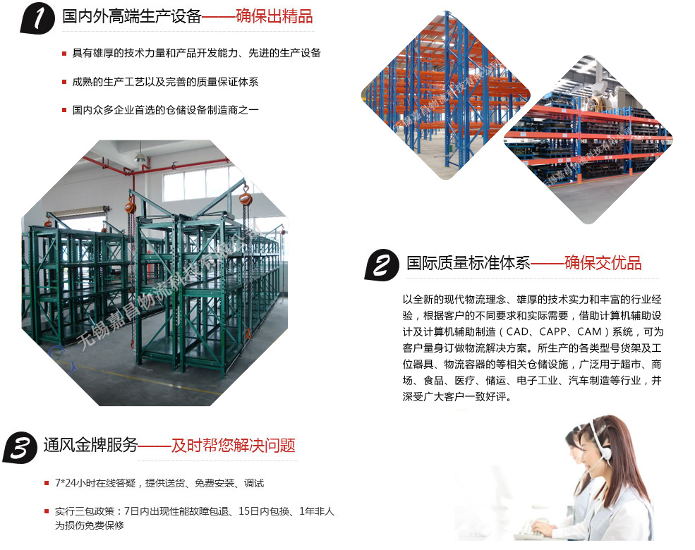 無錫嘉昌倉儲貨架有限公司是國內(nèi)現(xiàn)代倉儲物流技術(shù)開發(fā)、設(shè)計、生產(chǎn)和安裝的專業(yè)廠家,具有雄厚的技術(shù)力量和產(chǎn)品開發(fā)能力、先進的生產(chǎn)設(shè)備、成熟的生產(chǎn)工藝以及完善的質(zhì)量保證體系。公司始終“以質(zhì)量求生存,以信譽求發(fā)展的”的經(jīng)營理念,放眼世界,積極引進、吸收國際物流行業(yè)先進技術(shù),憑借專業(yè)的制作經(jīng)驗、優(yōu)秀的產(chǎn)品質(zhì)量,是國內(nèi)眾多企業(yè)首選的倉儲設(shè)備制造商之一。